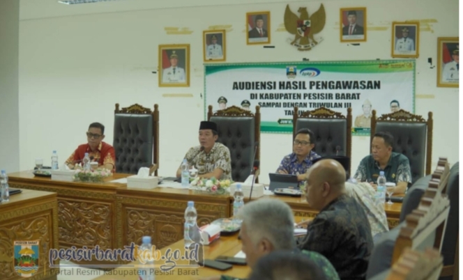 PESISIR BARAT-Bupati Pesisir Barat (Pesibar), Dedi Irawan menghadiri audiensi hasil pengawasan di Pesibar sampai dengan triwulan ke II oleh Perwakilan Badan Pemeriksa Keuangan dan Pembangunan (BPKP) Provinsi Lampung, di ruang Payung Agung, Lantai 4 Komplek Perkantoran Pemkab Pesibar, Jumat, 19 September 2025.